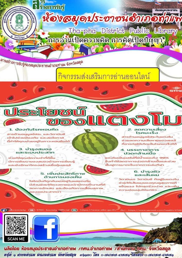ห้องสมุดประชาชนอำเภอท่าแพ จัดกิจกรรมส่งเสริมการอ่านออนไลน์ ประโยชน์ของแตงโม