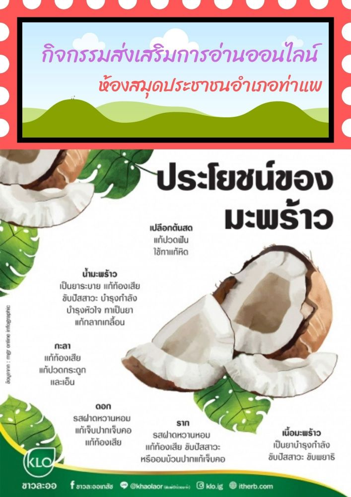 นางสาววชิรา คงพูล บรรณารักษ์ ห้องสมุดประชาชนอำเภอท่าแพ จัดกิจกรรมส่งเสริมการอ่านออนไลน์"ประโยชน์ของมะพร้าว" เพื่อส่งเสริมการอ่านให้กับประชาชนที่สนใจ อยู่ที่ไหนก็อ่านได้ทุกที่ ทุกเวลา ถ้ามีใจรัก