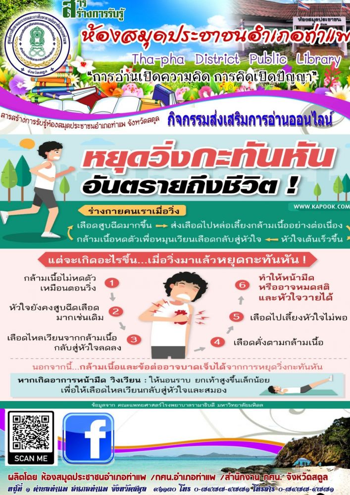 "หยุดวิ่งกะทันหัน อันตรายถึงชีวิต!" เพื่อส่งเสริมการอ่านในเรื่องของการวิ่งว่าควรดูแลสุขภาพอย่างไรให้ปลอดภัย และให้ประชาชนที่สนใจ รักการอ่านแล้วอย่าลืมมาหาความรู้กับห้องสมุดประชาชนอำเภอท่าแพกันเยอะๆนะคะ