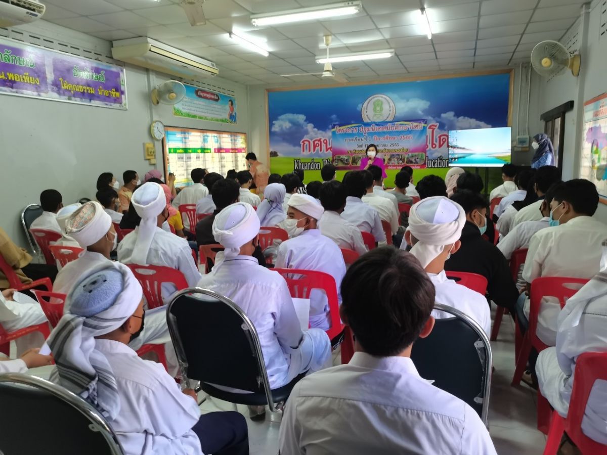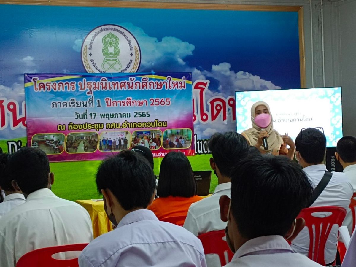 นางสาวอาฟีฟา อาลีมิง ครูอาสาประจำสถาบันปอเนาะ ได้รับมอบหมายจากนายคณาธิป บุญญารัตน์ รองผู้อำนวยการสำนักงาน กศน.จังหวัดสตูล รักษาการในตำแหน่งผู้อำนวยการ กศน.อำเภอควนโดน ให้นำนักศึกษาสถาบันศึกษาปอเนาะ ซึ่งเป็นนักศึกษาใหม่ประจำประภาคเรียนที่ 1 ปีการศึกษา 2565 เข้ารับการปฐมนิเทศ เพื่อทราบข้อชี้แจงสร้างการรับรู้เกี่ยวกับโครงสร้างหลักสูตรการศึกษานอกระบบระดับการศึกษาขั้นพื้นฐาน พ.ศ.2551 กำหนดข้อตกลงร่วมกันเพื่อยกระดับขีดความสามารถนักศึกษา ให้เป็นคนดี คนเก่ง กล้าแสดงออกเชิงสร้างสรรค์ มีความรับผิดชอบให้มากขึ้น ณ ห้องประชุม กศน.อำเภอควนโดน จังหวัดสตูล