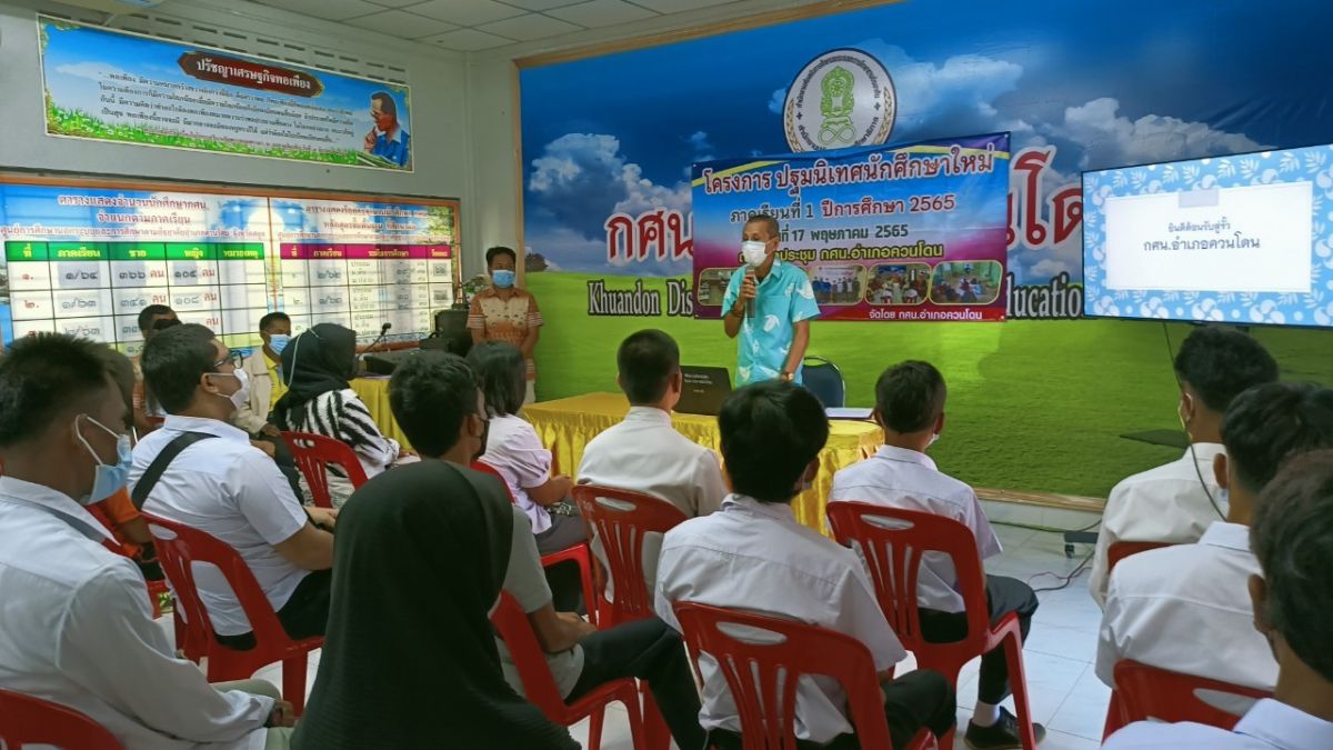 นายคณาธิป บุญญารัตน์ รองผู้อำนวยการสำนักงาน กศน.จังหวัดสตูล รักษาการในตำแหน่งผู้อำนวยการ กศน.อำเภอควนโดน มอบหมายให้บุคลากร กศน.อำเภอควนโดน จัดปฐมนิเทศนักศึกษาใหม่ ประจำภาคเรียนที่1 ปีการศึกษา2565 เพื่อชี้แจงสร้างการรับรู้เกี่ยวกับโครงสร้างหลักสูตรการศึกษานอกระบบระดับการศึกษาขั้นพื้นฐาน พ.ศ.2551 กำหนดข้อตกลงร่วมกันเพื่อยกระดับขีดความสามารถนักศึกษา ให้เป็นคนดี คนเก่ง กล้าแสดงออกเชิงสร้างสรรค์ มีความรับผิดชอบให้มากขึ้น ณ ห้องประชุม กศน.อำเภอควนโดน จังหวัดสตูล