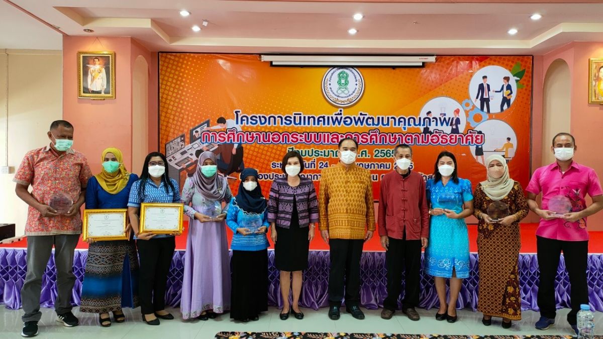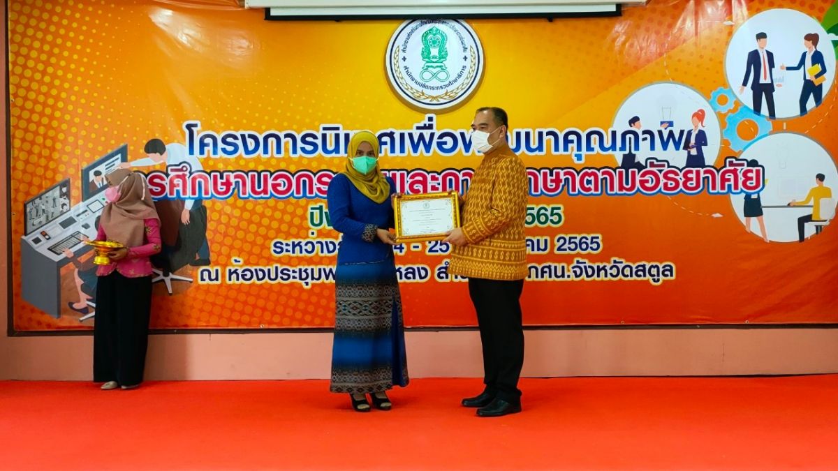 นางสาวรมณีย์ ทิ้งปากถ้ำ ครูอาสาสมัคร กศน.ตำบลย่านชื่อ ได้รับมอบหมายจากนายคณาธิป บุญญารัตน์ รองผู้อำนวยการสำนักงาน กศน.จังหวัดสตูล รักษาการในตำแหน่งผู้อำนวยการ กศน.อำเภอควนโดน เข้ารับเกียรติบัตรรางวัลชมเชย กศน.ตำบลต้นแบบ 5 ดี พรีเมี่ยม ประจำปี 2565 จากนายปรเมศวร์ ศิริรัตน์ รองเลขาธิการ กศน. ณ ห้องประชุมพญากาหลง สำนักงาน กศน.จังหวัดสตูล