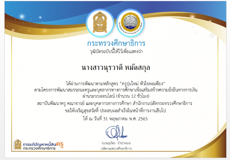 กศน.ตำบลย่านซื่อ เข้ารับการอบรมหลักสูตรการพัฒนาสมรรถนะครูและบุคลากรทางการศึกษาเพื่อเสริมสร้างความยั่งยืนทางการเงิน "ครูรุ่นใหม่หัวใจพอเพียง" ประจำปี 2565