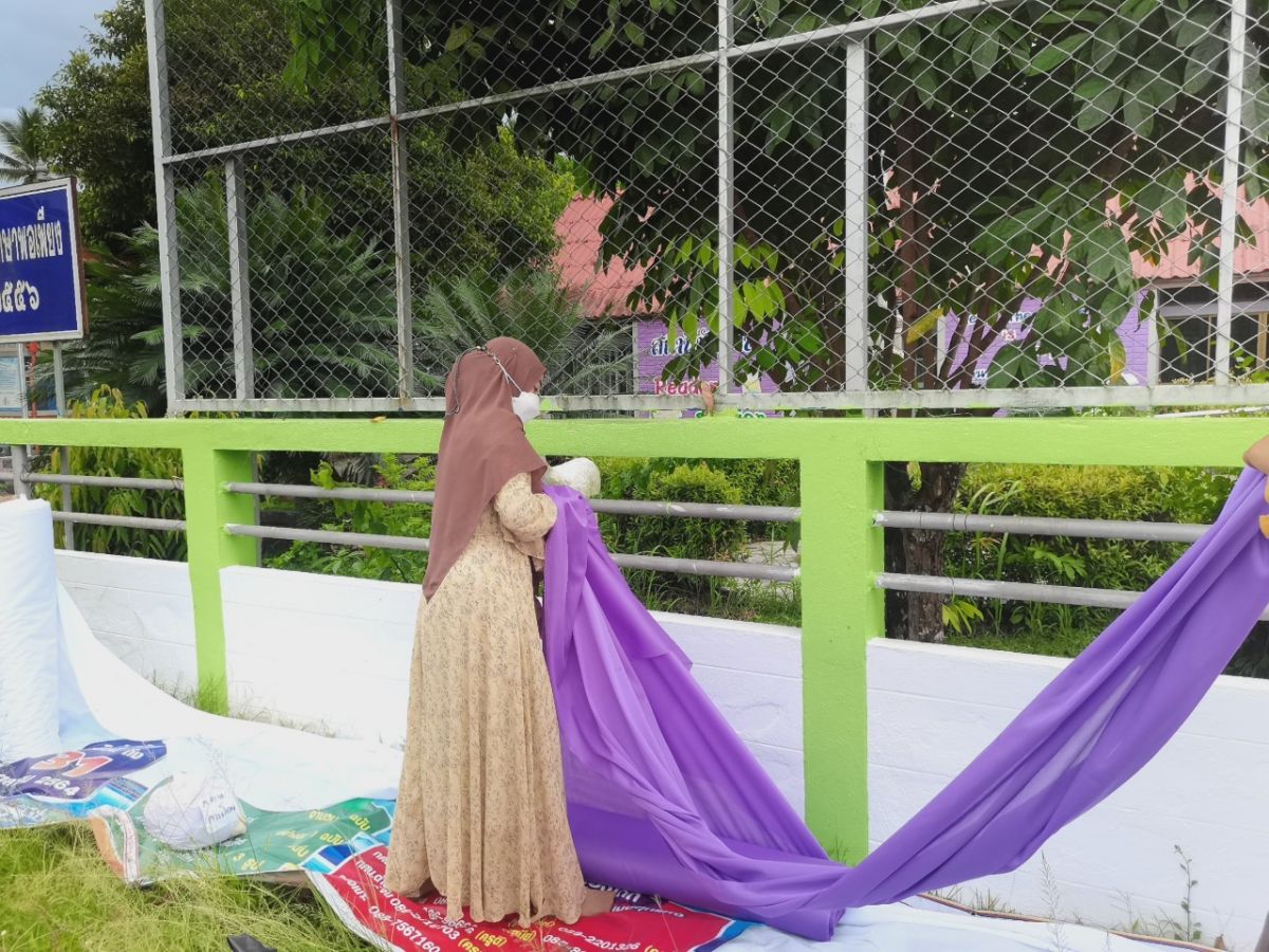 สถาบันศึกษาปอเนาะท่องจำอัลกุรอานอัลฟิรเดาส์ ร่วมประดับผ้าระบายสีม่วงร่วมกับผ้าระบายสีขาวพร้อมประดับพระฉายาลักษณ์ ประดับธงชาติคู่กับธงอักษรพระนามาภิไธย ส.ท.