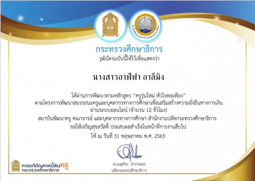 นางสาวอาฟีฟา อาลีมิง ครูอาสาสมัครฯ ประจำสถาบันศึกษาปอเนาะได้รับมอบหมายจาก นายคณาธิป บุญญารัตน์ รองผู้อำนวยการ สำนักงาน กศน.จังหวัดสตูล รักษาการในตำแหน่ง ผู้อำนวยการ กศน.อำเภอควนโดน จังหวัดสตูล เข้ารับการอบรมหลักสูตรการพัฒนาสมรรถนะครูและบุคลากรทางการศึกษาเพื่อเสริมสร้างความยั่งยืนทางการเงิน "ครูรุ่นใหม่หัวใจพอเพียง" ระหว่างวันที่ 17-31 พฤษภาคม 2565