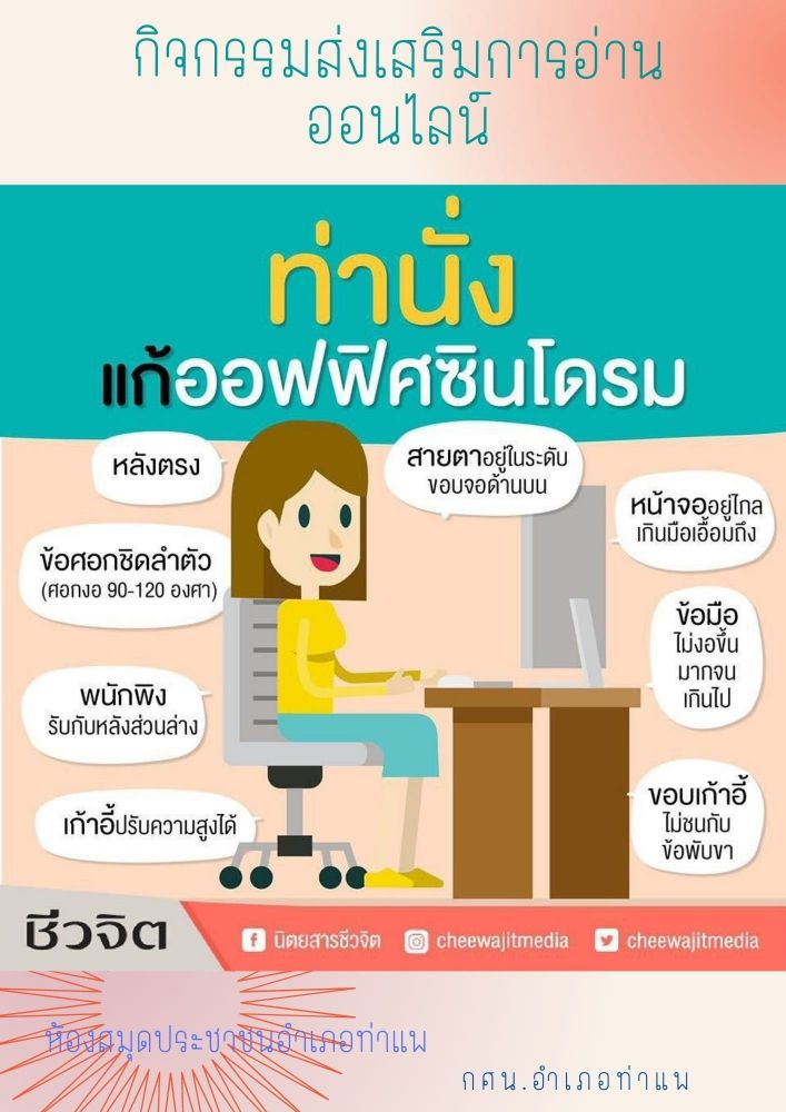 นางสาววชิรา คงพูล บรรณารักษ์ ห้องสมุดประชาชนอำเภอท่าแพ จัดกิจกรรมส่งเสริมการอ่านออนไลน์ท่านั่งแก้ออฟฟิศซินโดรม เพื่อส่งเสริมการอ่านให้กับประชาชนที่สนใจ นั่งที่ไหน อ่านที่นั่น ทำงานต้องดูแลสุขภาพกันเยอะๆๆ