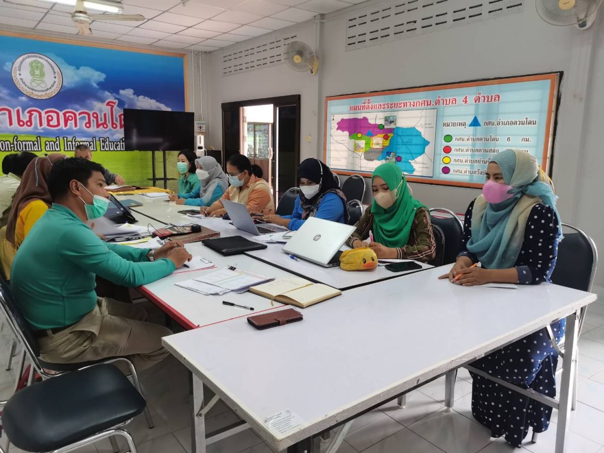 นางสาวฮาบีบะห์ เจ๊ะสมอเจ๊ะ ครู กศน.ตำบลควนโดน และนายอนันต์ ลัสมาน ครูอาสาสมัคร กศน.ตำบลควนโดน ได้รับมอบหมายจากนายคณาธิป บุญญารัตน์ รองผู้อำนวยการสำนักงาน กศน.จังหวัดสตูล รักษาการในตำแหน่งผู้อำนวยการ กศน.อำเภอควนโดน จังหวัดสตูล เป็นประธานดำเนินการประชุมบุคลากรในสถานศึกษา กศน.อำเภอควนโดน ประชุมเตรียมความพร้อมการจัดกิจกรรมงานการศึกษาต่อเนื่อง เพื่อร่วมกันวางแผนการจัดกิจกรรมโครงการขับเคลื่อนงาน กศน. และติดตามความก้าวหน้าการดำเนินการจัดกิจกรรมงานการศึกษานอกระบบและการศึกษาตามอัธยาศัย ณ ห้องประชุม กศน.อำเภอควนโดน อำเภอควนโดน จังหวัดสตูล
