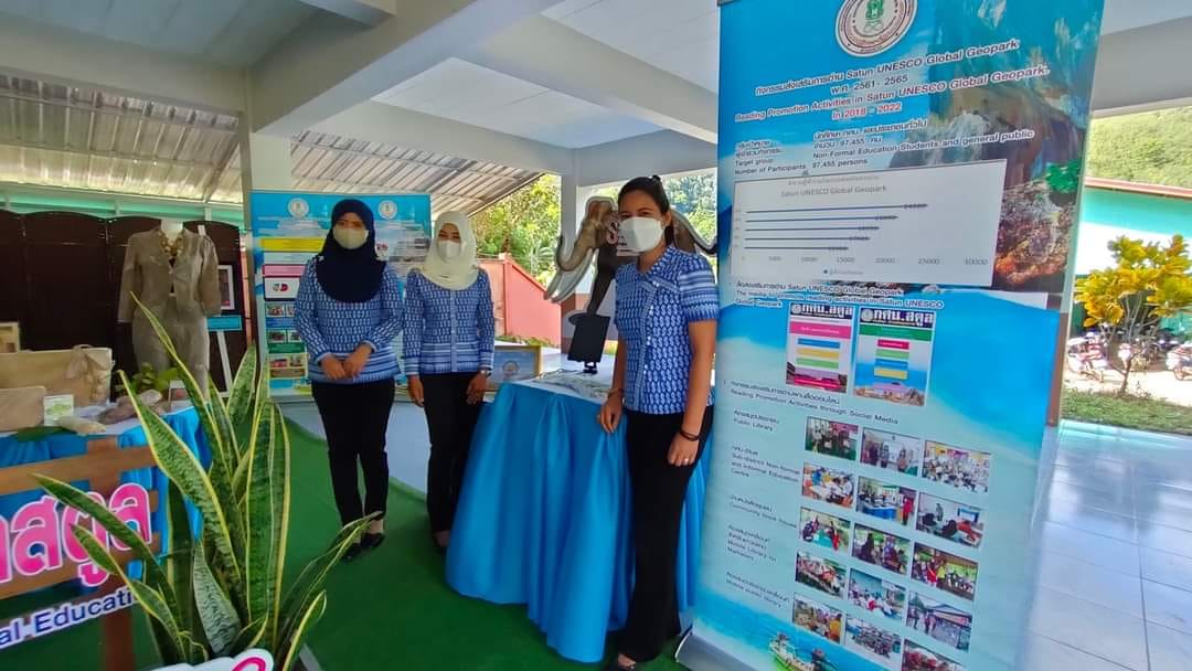 นางสาวจตุพร ทหารไทย ครูชำนาญการ รักษาการในตำแหน่ง ผู้อำนวยการ กศน.อำเภอมะนัง จังหวัดสตูล พร้อมด้วยผู้บริหารสถานศึกษา และคณะบุคลากร ร่วมจัดนิทรรศการด้านการจัดการศึกษา "อุทยานธรณีโลกสตูล" เพื่อรับการประเมินซ้ำอุทยานธรณีโลกสตูล ระดับโลก จากยูเนสโก (UNESCO) โดยผู้ประเมินจากยูเนสโก Ms.Marie-Luise Frey ผู้ประเมินอาวุโสจากสหพันธรัฐเยอรมนี และ Ms.Sarah Gamble ผู้ประเมินจากประเทศแคนาดา เพื่อขอรับรองเป็นอุทยานธรณีโลก