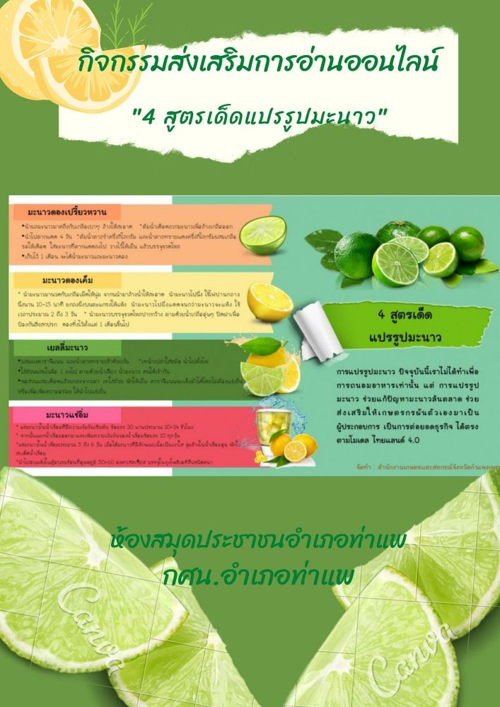 นางสาววชิรา คงพูล บรรณารักษ์ ห้องสมุดประชาชนอำเภอท่าแพ จัดกิจกรรมส่งเสริมการอ่านออนไลน์"4 สูตรเด็ดแปรรูปมะนาว" เพื่อส่งเสริมการอ่านให้กับประชาชนที่สนใจ ได้รู้ประโยชน์ของมะนาว และการแปรรูปมะนาว