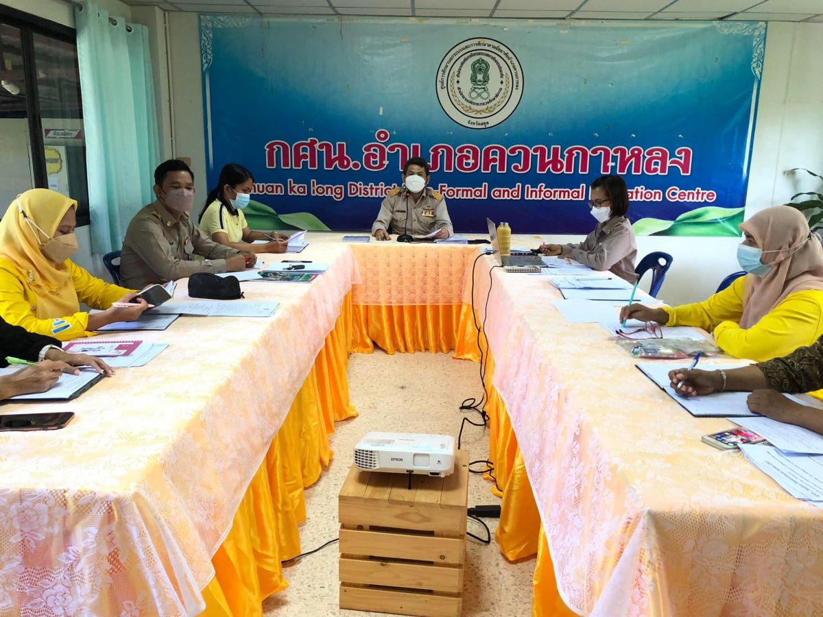 นายทวีศักดิ์ แซ่เจน ครูชำนาญการ รักษาการในตำแหน่งผู้อำนวยการศูนย์ กศน.อำเภอควนกาหลง ประชุมบุคลากรเพื่อติดตามการดำเนินงานกศน.ให้เป็นไปในทิศทางเดียวกันโดยกระบวนการดำเนินการจัดกิจกรรมเป็นไปตามแนวปฏิบัติการควบคุมและป้องกันการแพร่ระบาดของโรคติดเชื้อไวรัสโคโรน่า 2019