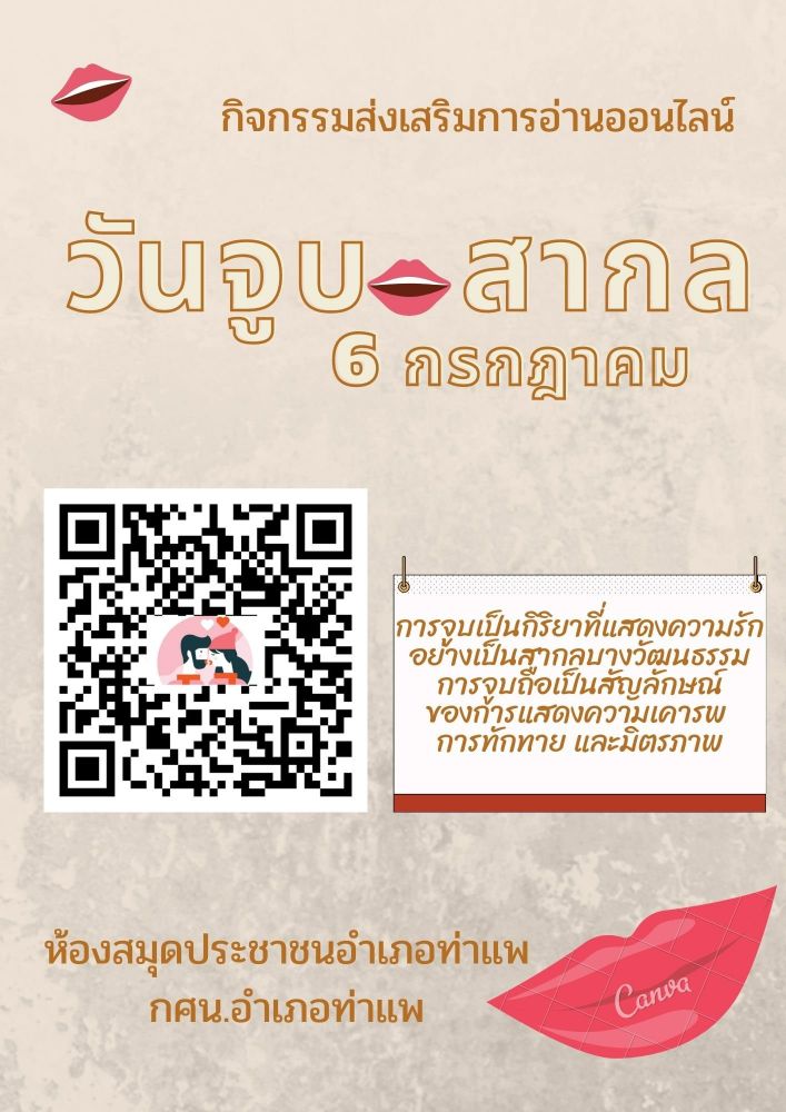 นางสาววชิรา คงพูล บรรณารักษ์ ห้องสมุดประชาชนอำเภอท่าแพ จัดกิจกรรมส่งเสริมการอ่านออนไลน์"วันจูบสากล 6 กรกฎาคม " เพื่อส่งเสริมการอ่านให้กับประชาชนที่สนใจ ได้มีความรู้เกี่ยวกับวันสำคัญ นั่งที่ไหน อ่านที่นั่น