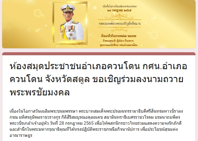 กศน.อำเภอควนโดน ห้องสมุดประชาชนอำเภอควนโดน จังหวัดสตูล ขอเชิญร่วมลงนามถวายพระพรชัยมงคล ลงนามถวายพระพรออนไลน์ เนื่องในโอกาสวันเฉลิมพระชนมพรรษา พระบาทสมเด็จพระปรเมนทรรามาธิบดีศรีสินทรมหาวชิราลงกรณ มหิศรภูมิพลราชวรางกูร กิติสิริสมบูรณอดุลยเดช สยามินทราธิเบศรราชวโรดม บรมนาถบพิตร พระวชิรเกล้าเจ้าอยู่หัว วันที่ 28 กรกฎาคม 2565