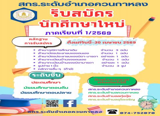 สกร.ระดับอำเภอควนกาหลง รับสมัครนักศึกษาใหม่ภาคเรียนที่ 1 / 2569