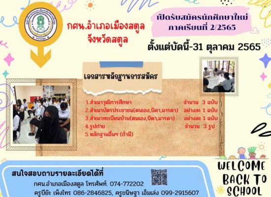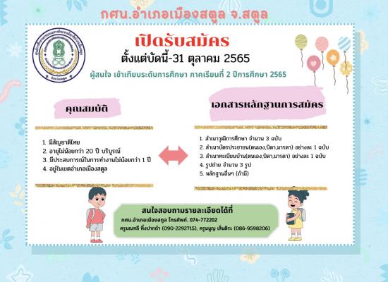 กศน.อำเภอเมืองสตูลเปิดรับสมัครนักศึกษาใหม่ภาคเรียนที่​ 2 ปีการศึกษา 2565 ตั้งแต่บัดนี้ ถึง 31 ตุลาคม 2565
