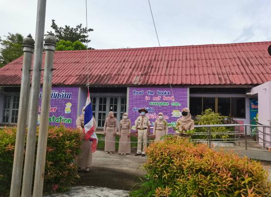 กศน.อำเภอควนโดน จังหวัดสตูล เคารพธงชาติ ทำกิจกรรมทางศาสนา เพื่อแสดงความจงรักภักดีต่อสถาบันชาติ ศาสนา และพระมหากษัตริย์