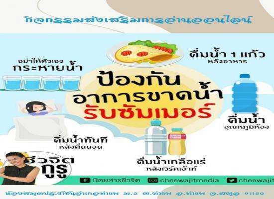 นางสาววชิรา คงพูล บรรณารักษ์ ห้องสมุดประชาชนอำเภอท่าแพ จัดกิจกรรมส่งเสริมการอ่านออนไลน์\"ป้องกันอาการขาดน้ำรับซัมเมอร์\" เพื่อส่งเสริมการอ่านให้กับประชาชนที่สนใจ ว่าเราควรปฏิบัติตัวอย่างไรเพื่อป้องกันอาการขาดน้ำ |