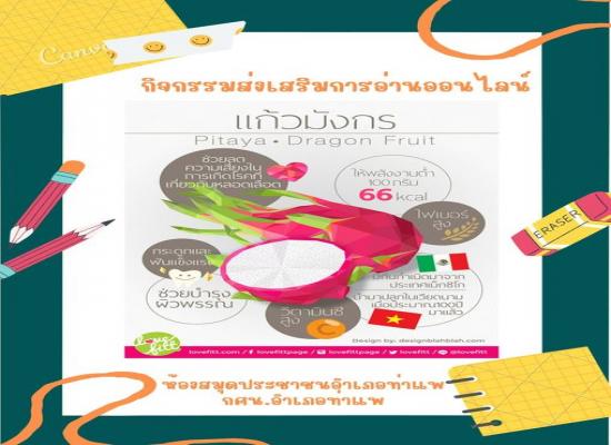 นางสาววชิรา คงพูล บรรณารักษ์ ห้องสมุดประชาชนอำเภอท่าแพ จัดกิจกรรมส่งเสริมการอ่านออนไลน์แก้วมังกร Dragon Fruit เพื่อส่งเสริมการอ่านให้กับประชาชนที่สนใจ นั่งที่ไหน อ่านที่นั่น ความรู้มีอยู่ทุกที่ที่เราต้องการ |