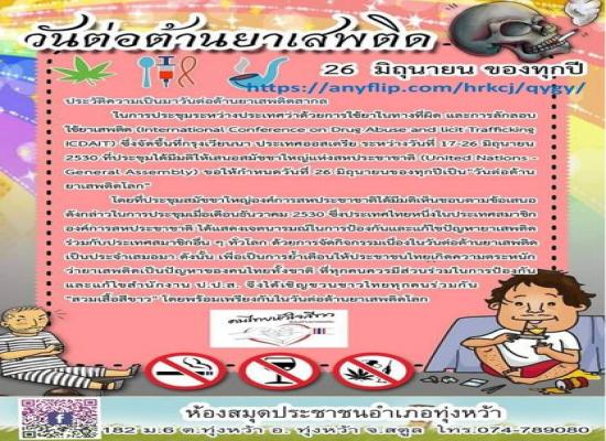 ห้องสมุดประชาชนอำเภอทุ่งหว้า ส่งเสริมการอ่านออนไลน์ E-BOOK \"26 มิถุนายน วันต่อต้านยาเสพติด