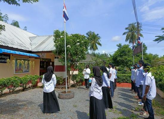 กศน.ตำบลควนสตอ อำเภอควนโดน จังหวัดสตูล เคารพธงชาติ ทำกิจกรรมทางศาสนา เพื่อแสดงความจงรักภักดีต่อสถาบันชาติ ศาสนา และพระมหากษัตริย์