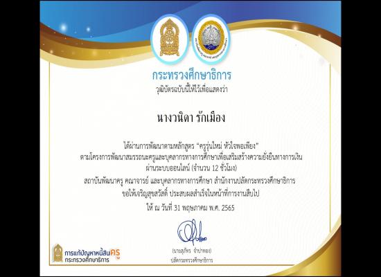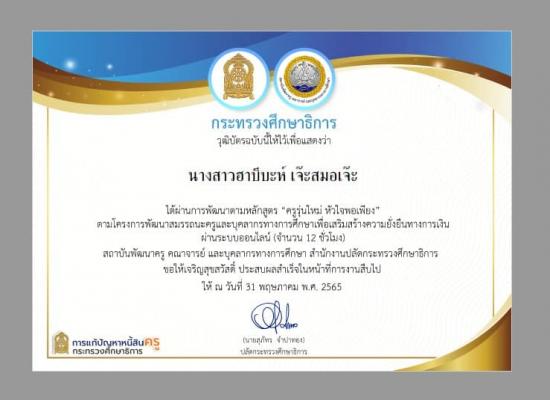 กศน.ตำบลย่านซื่อ เข้ารับการอบรมหลักสูตรการพัฒนาสมรรถนะครูและบุคลากรทางการศึกษาเพื่อเสริมสร้างความยั่งยืนทางการเงิน \"ครูรุ่นใหม่หัวใจพอเพียง\" ประจำปี 2565