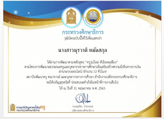 กศน.ตำบลวังประจัน เข้ารับการอบรมหลักสูตรการพัฒนาสมรรถนะครูและบุคลากรทางการศึกษาเพื่อเสริมสร้างความยั่งยืนทางการเงิน \"ครูรุ่นใหม่หัวใจพอเพียง\" ประจำปี 2565