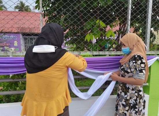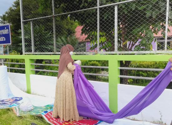 ครูอาสาสมัครประจำสถาบันปอเนาะอำเภอควนโดน จังหวัดสตูล ร่วมประดับผ้าระบายสีม่วงร่วมกับผ้าระบายสีขาวพร้อมประดับพระฉายาลักษณ์ ประดับธงชาติคู่กับธงอักษรพระนามาภิไธย ส.ท.