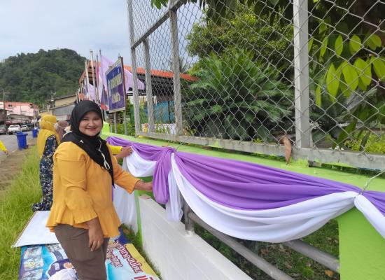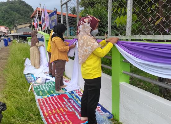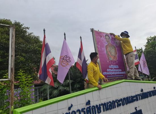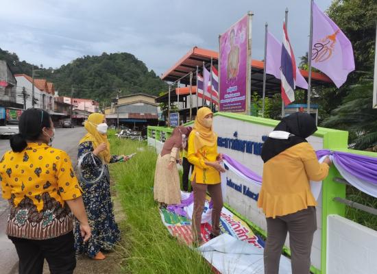 กศน.ตำบลควนสตอ จังหวัดสตูล ร่วมประดับผ้าระบายสีม่วงร่วมกับผ้าระบายสีขาวพร้อมประดับพระฉายาลักษณ์ ประดับธงชาติคู่กับธงอักษรพระนามาภิไธย ส.ท.