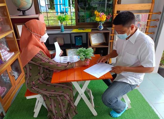 นางสาววชิรา คงพูล บรรณารักษ์ปฏิบัติการ รักษาการในตำแหน่ง ผู้อำนวยการ กศน.อำเภอท่าแพ จังหวัดสตูล มอบหมายให้ นางมัยมูนะห์ หะยีเหย็บ ครู อาสาฯ จัดกิจกรรมการศึกษาขั้นพื้นฐาน ระดับประถมศึกษา กลุ่มเป้าหมายพิเศษ คนพิการ นายจักกฤษ หยันยามีน |