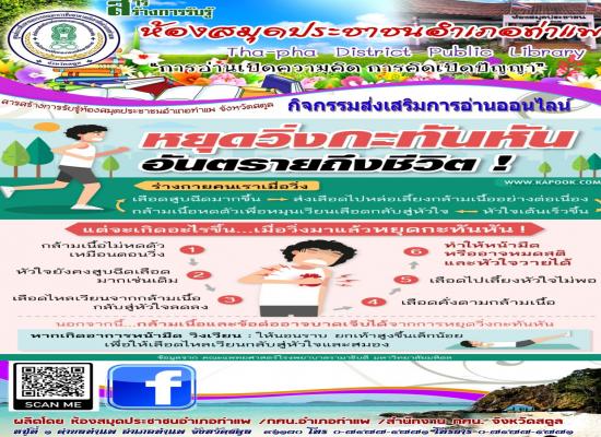 นางสาววชิรา คงพูล บรรณารักษ์ ห้องสมุดประชาชนอำเภอท่าแพ จัดกิจกรรมส่งเสริมการอ่านออนไลน์ \"หยุดวิ่งกะทันหัน อันตรายถึงชีวิต!\" เพื่อส่งเสริมการอ่านในเรื่องของการวิ่งว่าควรดูแลสุขภาพอย่างไรให้ปลอดภัย |