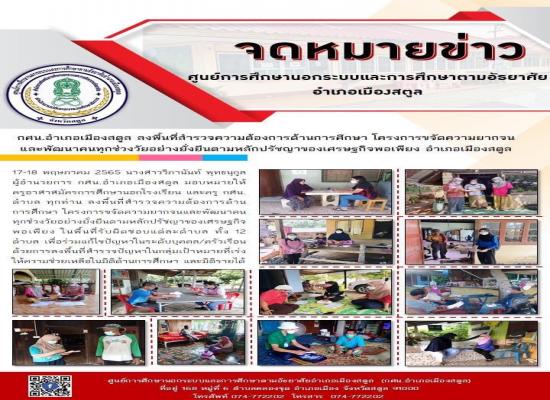 กศน.อำเภอเมืองสตูล ลงพื้นที่สำรวจความต้องการด้านการศึกษา โครงการขจัดความยากจนและพัฒนาคนทุกช่วงวัยอย่างยังยืนตามหลักปรัชญาของเศรษฐกิจพอเพียง อำเภอเมืองสตูล