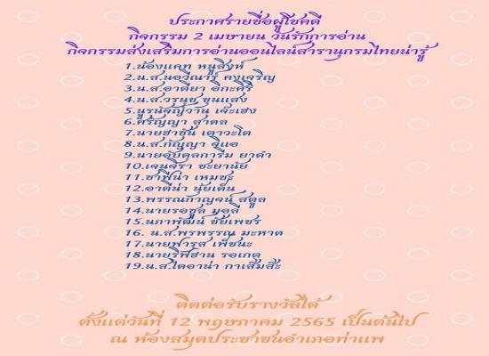 ห้องสมุดประชาชนอำเภอท่าแพ ประกาศรายชื่อผู้ร่วม\"กิจกรรมส่งเสริมการอ่านออนไลน์