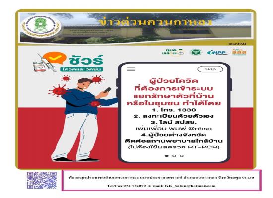 จัดกิจกรรมส่งเสริมการอ่านผ่านสื่อออนไลน์ 8 มีนาคม 2565 นายทวีศักดิ์ แซ่เจน ครูชำนาญการ รักษาการในตำแหน่งผู้อำนวยการ กศน. อำเภอควนกาหลง มอบหมายให้บรรณารักษ์ห้องสมุดประชาชนอำเภอควนกาหลง จัดกิจกรรมส่งเสริมการอ่านผ่านสื่อออนไลน์ในช่วงสถานการณ์การแพร่ระบาดของ |