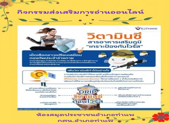 นางสาววชิรา คงพูล บรรณารักษ์ ห้องสมุดประชาชนอำเภอท่าแพ จัดกิจกรรมส่งเสริมการอ่านออนไลน์ \" วิตามินซี สารอาหารเสริมภูมิ เกราะป้องกันไวรัส\" เพื่อส่งเสริมการอ่านให้กับประชาชนได้รู้จักดูแลตนเองและคนรอบข้าง |
