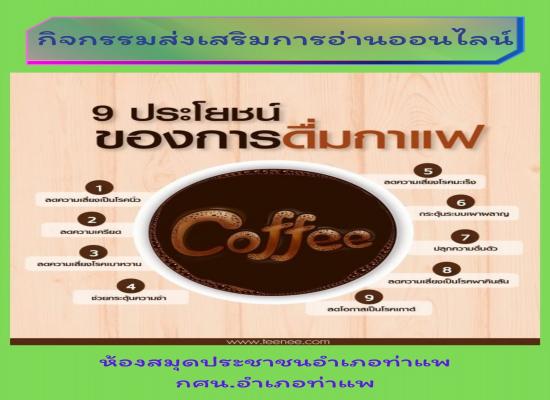 นางสาววชิรา คงพูล บรรณารักษ์ ห้องสมุดประชาชนอำเภอท่าแพ จัดกิจกรรมส่งเสริมการอ่านออนไลน์ \" 9 ประโยชน์ของการดื่มกาแฟ\" เพื่อส่งเสริมการอ่านให้กับประชาชนที่สนใจ ได้รับความรูู้เกี่ยวกับการดื่มกาแฟและการดูแลสุขภาพ |
