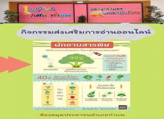นางสาววชิรา คงพูล บรรณารักษ์ ห้องสมุดประชาชนอำเภอท่าแพ จัดกิจกรรมส่งเสริมการอ่านออนไลน์ \"ผักอาบสารพิษ\" เพื่อส่งเสริมการอ่านให้กับประชาชนที่สนใจ ได้รับความรู้และระวังในการรับประทานผัก เป็นการดูแลสุขภาพของตนเองและคนในครอบครัว |