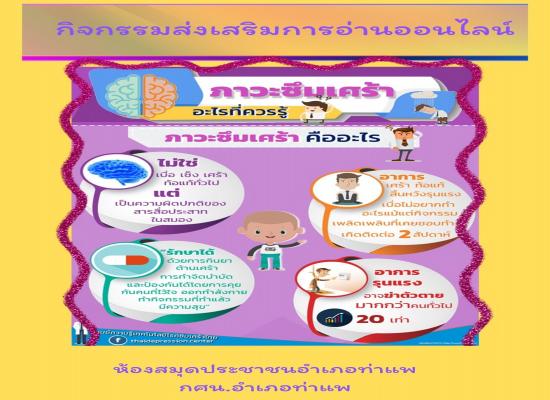นางสาววชิรา คงพูล บรรณารักษ์ ห้องสมุดประชาชนอำเภอท่าแพ จัดกิจกรรมส่งเสริมการอ่านออนไลน์ ภาวะซึมเศร้า อะไรที่ควรรู้ เพื่อส่งเสริมการอ่านให้กับผู้รับบริการได้มีความรู้ และรู้จักสังเกตพฤติกรรมของตนเองและคนรอบข้าง |