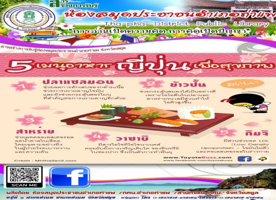นางสาววชิรา คงพูล บรรณารักษ์ ห้องสมุดประชาชนอำเภอท่าแพ จัดกิจกรรมส่งเสริมการอ่านออนไลน์ \"5 เมนู อาหารญี่ปุ่นเพื่อสุขภาพ\" เพื่อส่งเสริมการอ่านให้กับผู้รับบริการได้มีความรู้ และรู้จักเลือกที่จะรับประทานเพื่อสุขภาพ |
