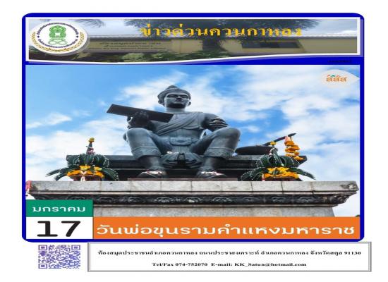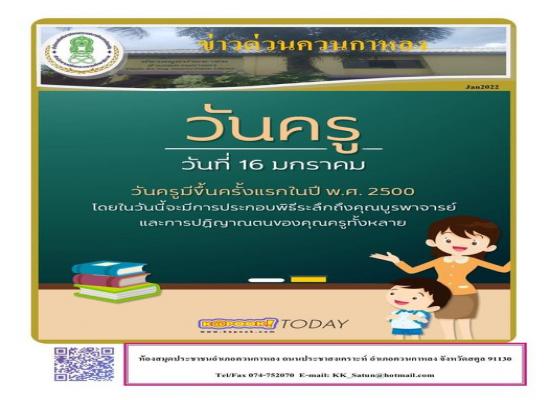 จัดกิจกรรมส่งเสริมการอ่านผ่านสื่อออนไลน์ เนื่องในวันครู ๑๖ มกราคม ๒๕๖๕ นายทวีศักดิ์ แซ่เจน ครูชำนาญการ รักษาการในตำแหน่งผู้อำนวยการ กศน. อำเภอควนกาหลง มอบหมายให้บรรณารักษ์ห้องสมุดประชาชนอำเภอควนกาหลง จัดกิจกรรมส่งเสริมการอ่านผ่านสื่อออนไลน์ในช่วงสถานการณ |