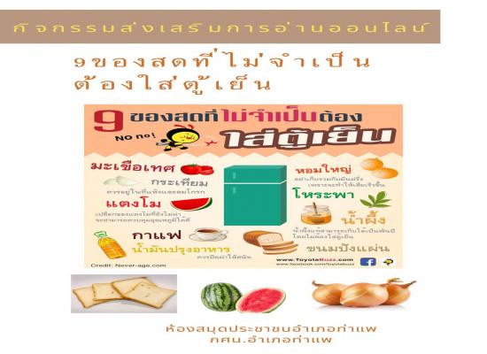 นางสาววชิรา คงพูล บรรณารักษ์ ห้องสมุดประชาชนอำเภอท่าแพ จัดกิจกรรมส่งเสริมการอ่านออนไลน์ \"9 ของสดที่ไม่จำเป็นต้องใส่ตู้เย็น\" เพื่อส่งเสริมการอ่านให้กับผู้รับบริการได้มีความรู้และนำไปปรับใช้ในชีวิตประจำวัน |