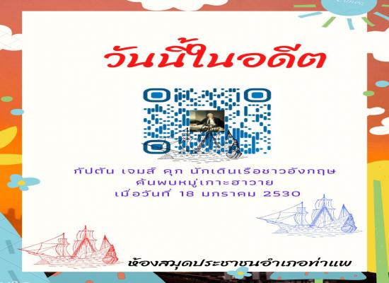 นางสาววชิรา คงพูล บรรณารักษ์ ห้องสมุดประชาชนอำเภอท่าแพ จัดกิจกรรมส่งเสริมการอ่านออนไลน์ \"วันนี้ในอดีต 18 มกราคม\" เพื่อส่งเสริมการอ่านให้กับผู้รับบริการ ให้เรียนรู้เกี่ยวกับวันสำคัญในอดีต เรียนรู้กับสิ่งรอบตัว |