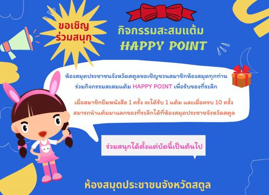 ห้องสมุดประชาชนจังหวัดสตูลขอเชิญชวนสมาชิกทุกท่านร่วมสนุกกับกิจกรรมสะสมแต้ม happy point แลกของที่ระลึกเพียงแค่สมาชิกยืมหนังสือ 1 ครั้ง จะได้รับ 1 แต้มและเมื่อครบ 10 ครั้ง สมารถนำแต้มแลกรับของที่ระลึกจากห้องสมุดประชาชนจังหวัดสตูล #ร่วมกิจกรรมได้ตั้งแต่บัดนี