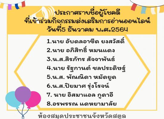 ประกาศรายชื่อผู้โชคดีที่เข้าร่วมกิจกรรม ๕ ธันวาคม ๒๕๖๔ สามารถติดต่อรับของรางวัลได้ที่ห้องสมุดประชาชนจังหวัดสตูล