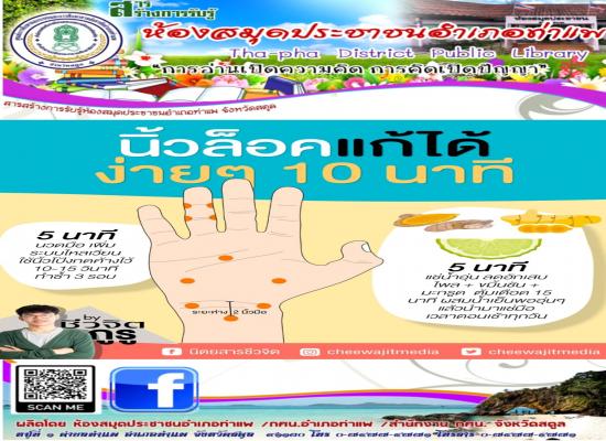 นางสาววชิรา คงพูล บรรณารักษ์ ห้องสมุดประชาชนอำเภอท่าแพ จัดกิจกรรมส่งเสริมการอ่านออนไลน์นิ้วล็อคแก้ได้ ง่ายๆ 10 นาทีเพื่อให้ผู้รับบริการได้รับความรู้ เกี่ยวกับสุขภาพของเราเองและนำไปปรับใช้ในการออกกำลังกายเล็กๆน้อยๆ |