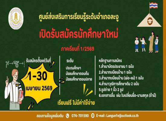 ศูนย์ส่งเสริมการเรียนรู้ระดับอำเภอละงู รับสมัครนักศึกษาใหม่ ภาคเรียนที่ 1/2569