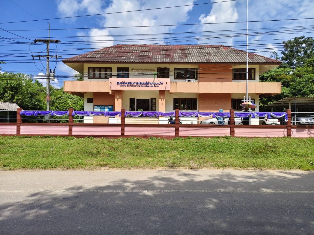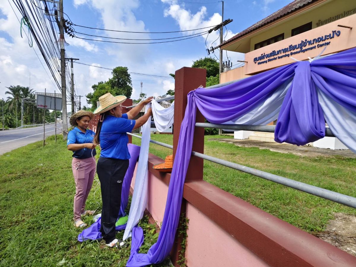 ศูนย์ส่งเสริมการเรียนรู้ระดับอำเภอมะนัง จัดตกแต่งสถานที่ประดับพระบรมฉายาลักษณ์สมเด็จพระนางเจ้าฯ พระบรมราชินี ประดับธงชาติไทยร่วมกับธงอักษรพระนามาภิไธย ส.ท. และประดับผ้าระบายสีม่วงร่วมกับผ้าระบายสีขาวตามอาคารสำนักงาน สกร.ระดับอำเภอมะนัง