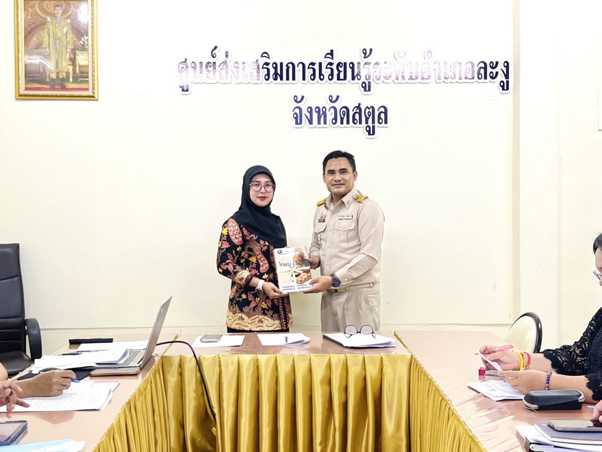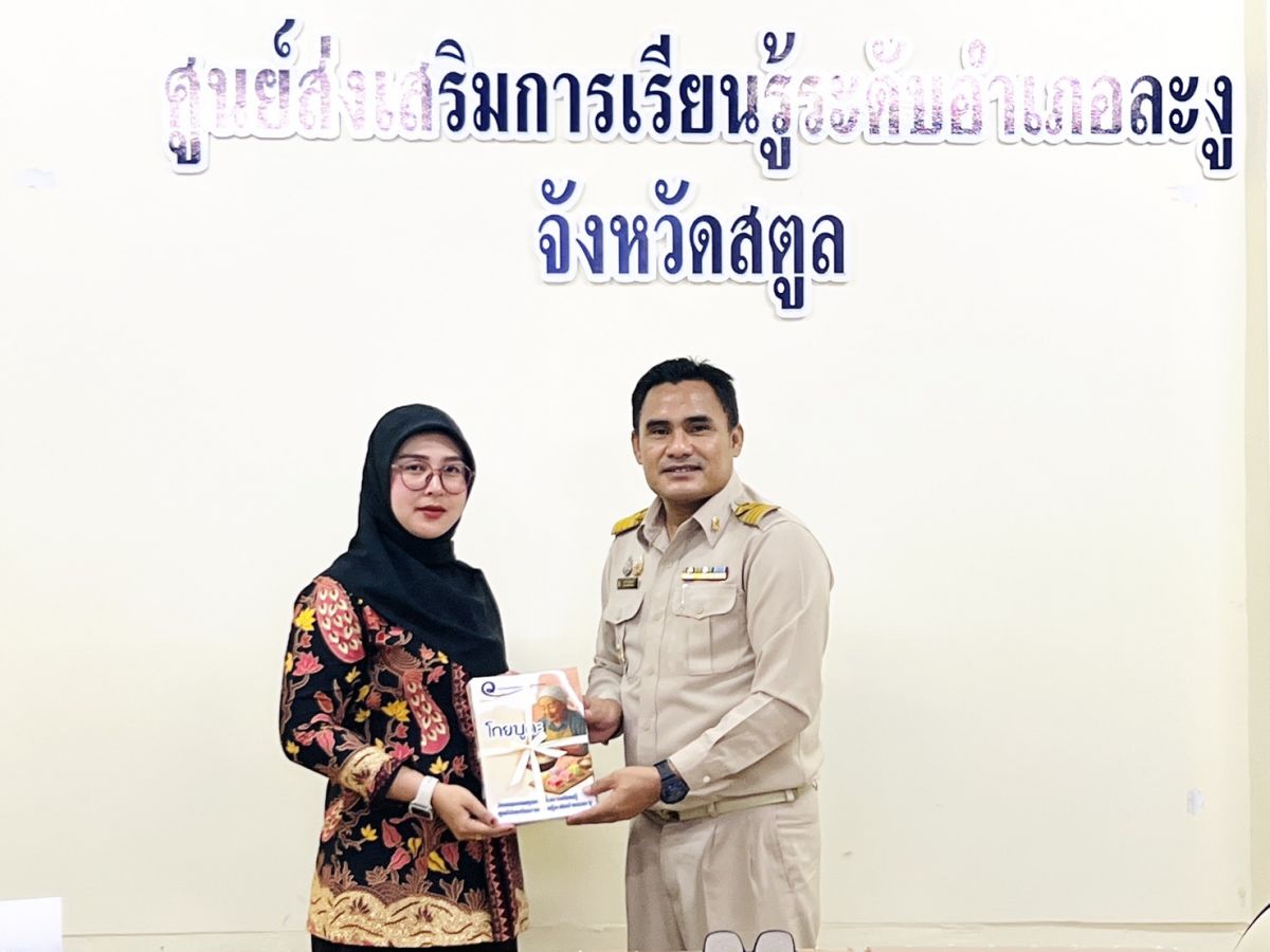 นายอาดำ ลิงาลาห์ ผู้อำนวยการสถานศึกษาศูนย์ส่งเสริมการเรียนรู้ระดับอำเภอท่าแพ รักษาการในตำแหน่ง ผู้อำนวยการสถานศึกษาศูนย์ส่งเสริมการเรียนรู้ระดับอำเภอละงู มอบหนังสือวรรณกรรมชุมชนจังหวัดสตูล เพื่อการเรียนรู้ ให้กับห้องสมุดประชาชนอำเภอละงู ณ ห้องประชุม สกร.ระดับอำเภอละงู จังหวัดสตูล