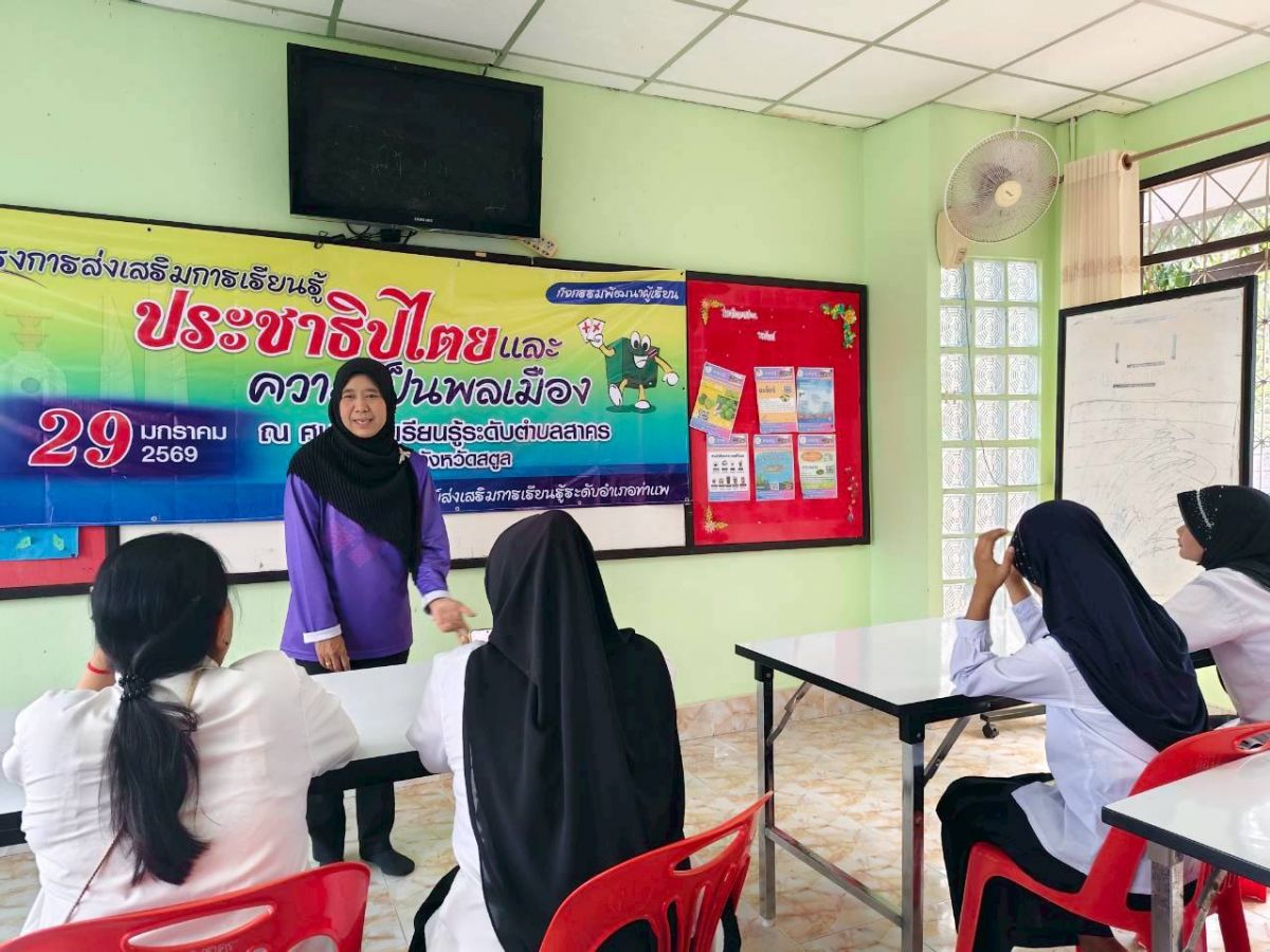 นายอาดำ ลิงาลาห์ ผู้อำนวยการสถานศึกษาศูนย์ส่งเสริมการเรียนรู้ระดับอำเภอท่าแพ มอบหมายให้ครูศูนย์การเรียนรู้ จัดกิจกรรมโครงการส่งเสริมการเรียนรู้ประชาธิปไตยในสังคมไทยและความเป็นพลเมือง ให้กับนักศึกษา ณ ศกร.ระดับตำบลสาคร อำเภอท่าแพ จังหวัดสตูล