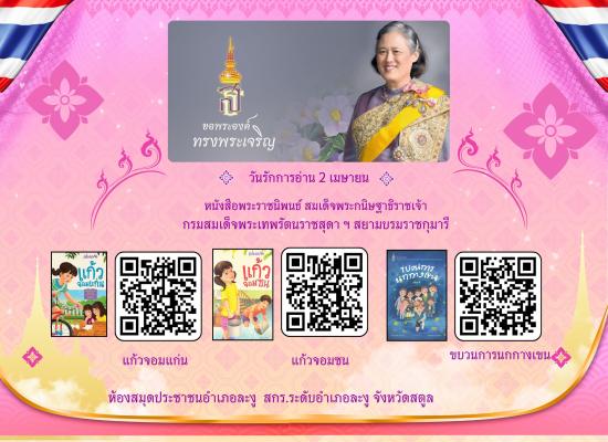 ห้องสมุดประชาชนอำเภอละงู เชิญชวนทุกท่านร่วมอ่านและร่วมตอบคำถามจากหนังสือพระราชนิพนธ์ สมเด็จพระกนิษฐาธิราชเจ้ากรมสมเด็จพระเทพรัตนราชสุดาฯสยามบรมราชกุมารี เรื่องแก้วจอมแก่น เรื่องแก้วจอมซน และเรื่องขนบวนการนกกางเขน วันรักการอ่าน 2 เมษายน 2569