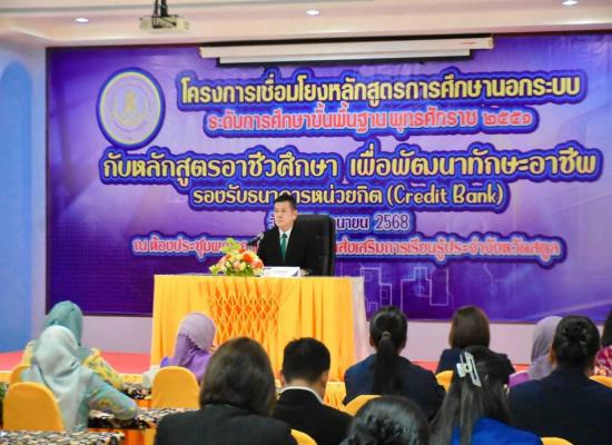 วันที่ 25 มิถุนายน 2568 สกร.ระดับอำเภอควนโดน เข้าร่วมโครงการเชื่อมโยงหลักสูตรการศึกษานอกระบบระดับการศึกษาขั้นพื้นฐาน พุทธศักราช 2551 กับหลักสูตรอาชีวศึกษา เพื่อพัฒนาทักษะอาชีพรองรับธนาคารหน่วยกิต Credit Bank ยุคใหม่ เรียนรู้ ไม่มีรั้ว\"