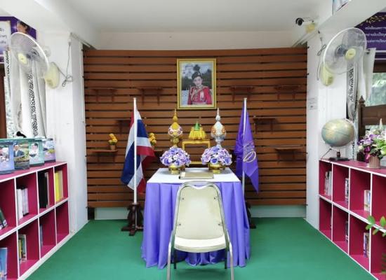 ศูนย์ส่งเสริมการเรียนรู้ระดับอำเภอมะนัง จัดตกแต่งสถานที่ประดับพระบรมฉายาลักษณ์สมเด็จพระนางเจ้าฯ พระบรมราชินี ประดับธงชาติไทยร่วมกับธงอักษรพระนามาภิไธย ส.ท. และประดับผ้าระบายสีม่วงร่วมกับผ้าระบายสีขาวตามอาคารสำนักงาน สกร.ระดับอำเภอมะนัง